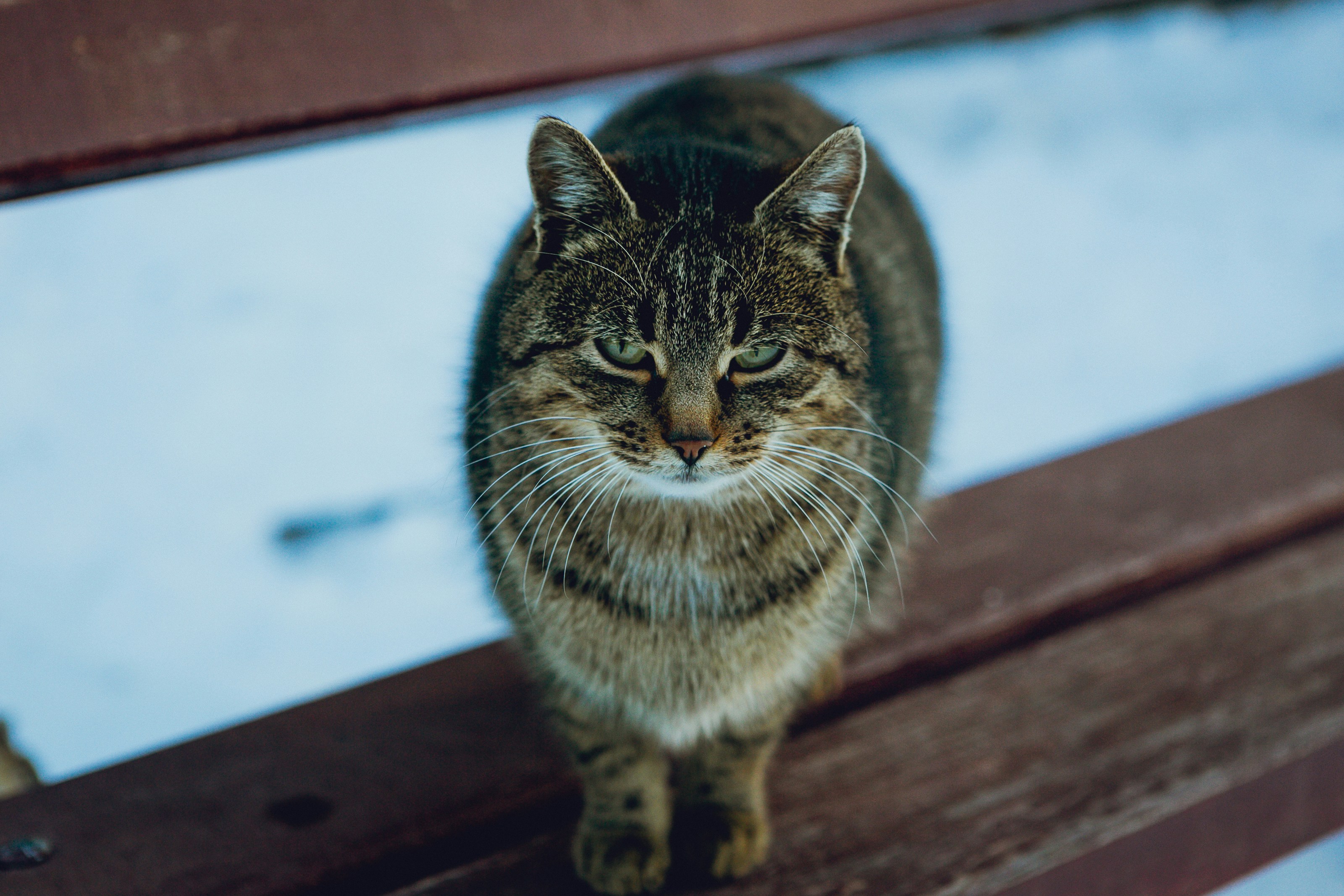 Cat On A Brown Bench Photo Free Grey Image On Unsplash